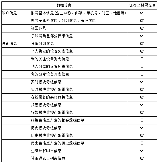 用户可以选择将慧网V1.0 应用迁移到V2.0版本,以获得更好的服务和支持。迁移过程中,我们将想尽可能让尽可能多的用户数据将被转移到慧网V2.0 应用中,以便继续使用和管理,但由于架构和技术原因,部分数据我们没办法做迁移(请见附录一),这里特向要迁移的用户进行解释说明。